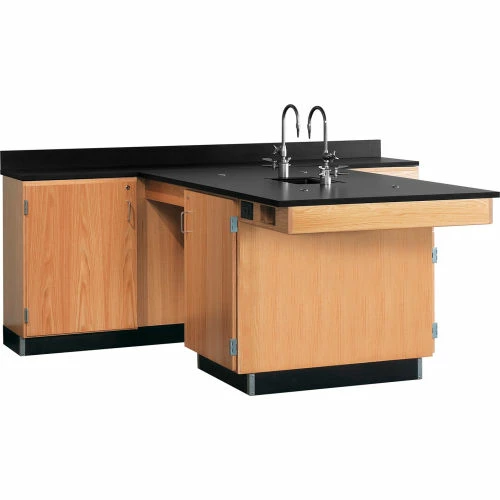 Perimeter workstation provides work space for up to four students and valuable storage space. Made of solid oak, oak and hardwood veneers, this unit includes a 1″ solid epoxy top, epoxy sink with strainer, two multiservice fixtures, four rod sockets, rod storage, two GFI protected AC duplex receptacles, and locks on all the doors. Cabinet style: Full Door.