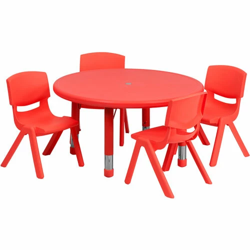 The Adjustable Round Plastic Activity Table and Stack Chair Set will make a great addition to any kindergarten or day care center. Constructed with a strong plastic top layer, this adjustable rectangular table is strong, durable and easy to clean after painting, coloring, eating or other activities.