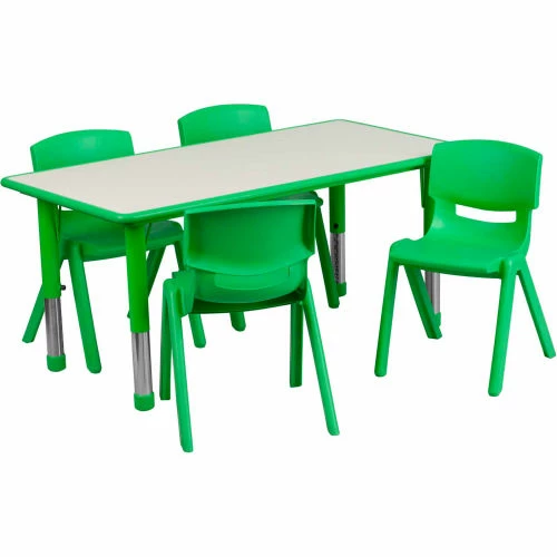 This table set is excellent for early childhood development. Primary colors make learning and play time exciting when several colors are arranged in the classroom. This durable table features a smooth grey table top with safety rounded plastic edges and steel welding underneath along with adjustable steel legs that is sure to last throughout the years. The chair has been properly designed to fit young children to develop proper sitting habits that will last a lifetime.