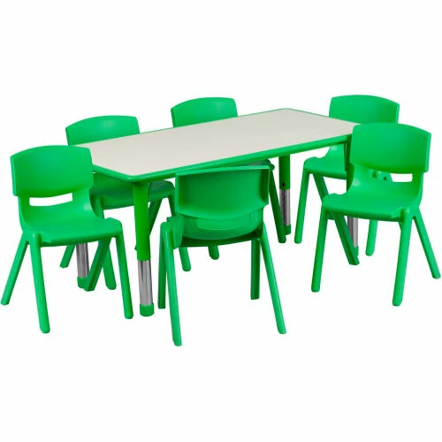 This table set is excellent for early childhood development. Primary colors make learning and play time exciting when several colors are arranged in the classroom. This durable table features a smooth grey table top with safety rounded plastic edges and steel welding underneath along with adjustable steel legs that is sure to last throughout the years. The chair has been properly designed to fit young children to develop proper sitting habits that will last a lifetime.