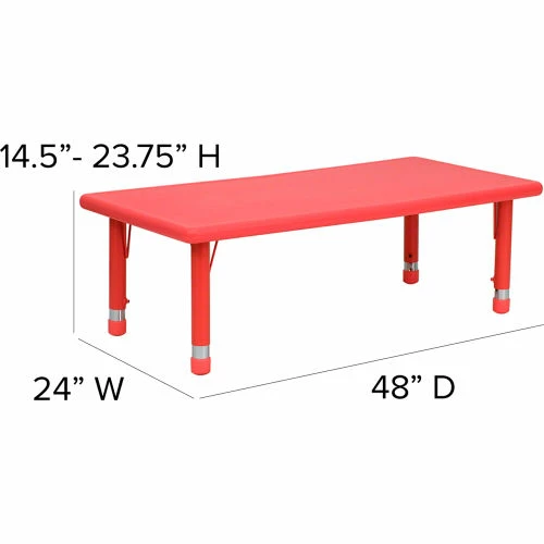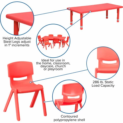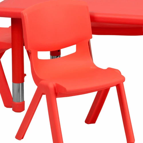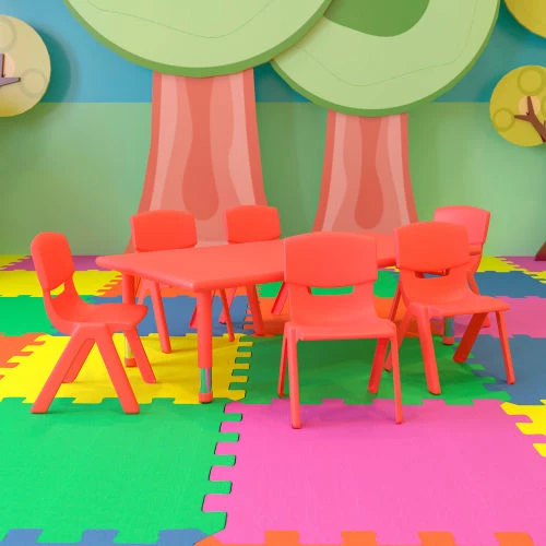 The Plastic Activity Table with 6 Chairs is a must have for daycare, preschool and early childhood development centers. It will accommodate children up to age 7. The durable table features a 24″ x 48″ rectangular top with rounded corners for safety and a welded, steel frame for increased stability. Adjustable height legs give you the flexibility to raise or lower the table a full 9 inches. The lightweight stack chairs are contoured for comfort, have a 10.5″ seat height and can be stacked up to 10 high. Floor glides protect your floor by sliding smoothly when you need to move the set. Perfect for craft time, snack time and party time, this easy to clean table set is just the right size for small children.