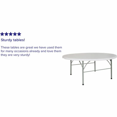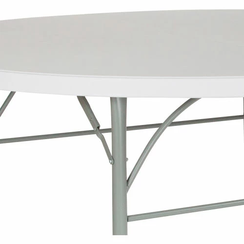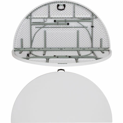 This round folding table is 6 feet long and is beneficial in a multitude of settings that include banquet halls, conference centers, cafeterias, schools and in the home. The table can be used as a temporary seating solution or be setup for everyday use. The bi-fold feature folds the table in half the size and includes a carrying handle for easy transport. The durable blow molded top is low maintenance and cleans easily. The table legs fold under the table to make storage more convenient and for better portability. This table is commercial grade to withstand everyday use in the hospitality industry.