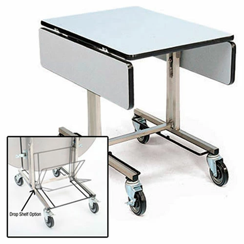 Forbes room Service Table has a tilt up rectangular tabletop. The ultra series style has 2 tri-fold drop leaves, and fixed vinyl dipped hot box rails. These shelves fold up when not in use for better storage.