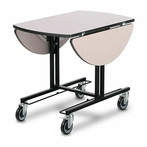 Forbes Room Service Table, oval tabletop – 36″L x 43″W with 2 bi-fold drop leaves, Deco Series, painted steel frame, and fixed vinyl dipped hot box rails. This model can also be ordered with vinyl-dipped drop down shelves – see image below) for hot and cold box storage in place of our fixed rails. These shelves fold up when not in use to provide better nestability.