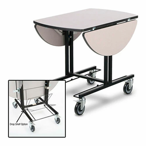Forbes Room Service Table has an oval tabletop – 36″L x 43″W with two bi-fold drop leaves, and vinyl- dipped drop down shelves for hot and cold box storage. These shelves fold up when not in use to provide better nestability. Ultra Series, painted steel frame.