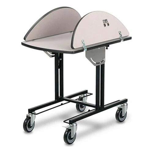 Forbes Room Service Table has an oval tabletop – 36″L x 43″W with two tri-fold drop leaves the Deco Series has a painted steel frame, and fixed vinyl dipped hot box rails.