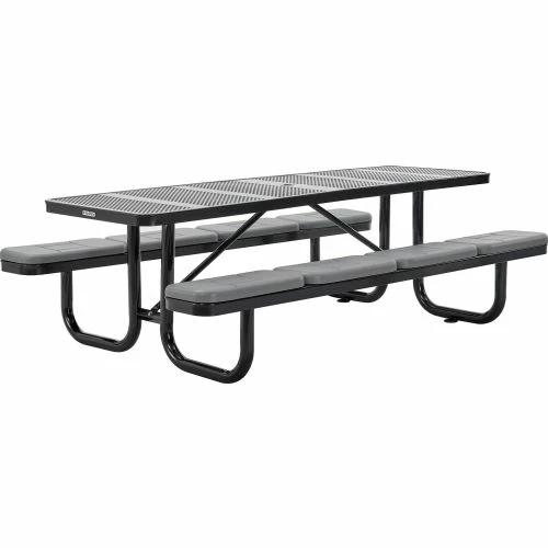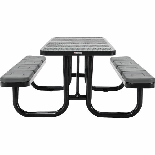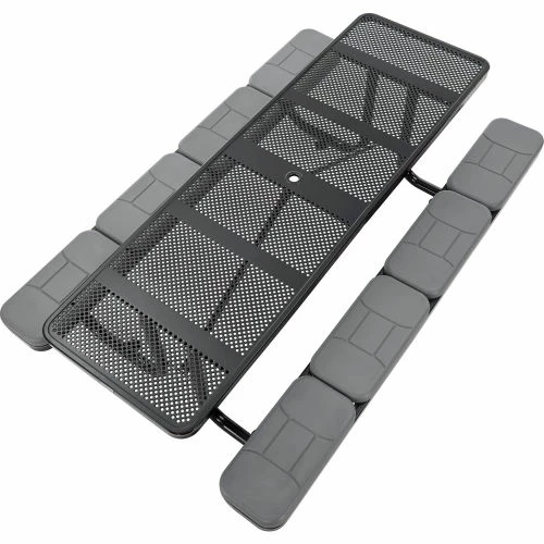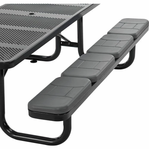 Enjoy the great outdoors more comfortably with the Global Industrial 8′ Rectangular Picnic Table in Perforated Metal. This commercial picnic table is ideal for high-traffic areas such as parks, campuses, school yards, and more. Each outdoor table is constructed of heavy-gauge perforated metal with beveled corners for added safety. The thermoplastic coating is designed to resist fading, mold, and vandalism; and will also help ensure maintenance-free durability. The table’s protective coating presents a smooth, high-gloss surface that stays cool-to-the-touch, allowing users to sit comfortably on even the hottest days. An additional zinc-rich layer offers an extra superior coating to withstand corrosion in any environment. Mounting tabs allow anchoring to the ground to promote stability and prevent theft. 7-Year Limited Warranty.