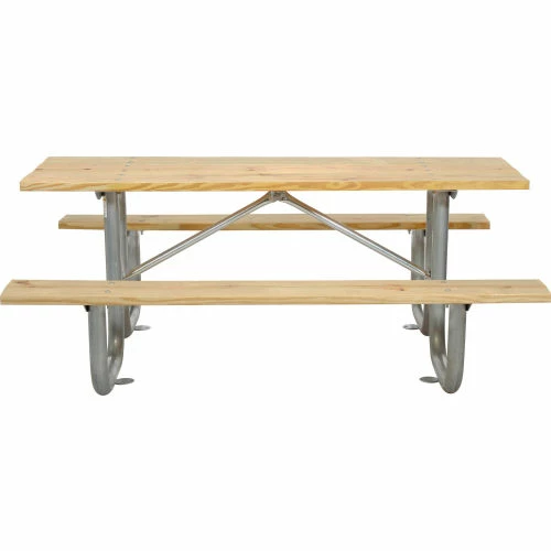 Wood picnic table is perfect for campgrounds, parks, playgrounds and other outdoor municipalities. This table features solid pine planks, 9″W and 2″ thick, that are environmentally sound. A non-arsenic based treatment on the wood protects against decay, rot, insect infestation and biodeterioration. Solid heavy duty galvanized steel frame is built to last.