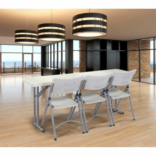 Conveniently lightweight and transportable. The blow molded plastic tabletop is scratch-resistant yet still enables a surface smooth enough for writing. The textured gray powder-coated 16-gauge steel frame features leg braces with spring-loaded push-button closing capability for maximal ease and stability. Best of all, the cantilevered legs offer ample and comfy leg room to prevent the user from banging their knees. 700 lb. weight capacity. 10 Year Limited Warranty.