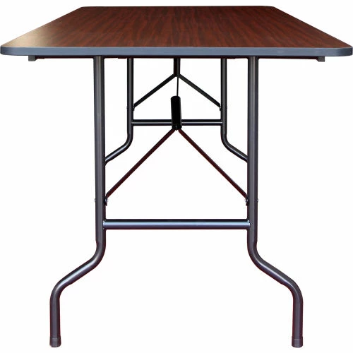 Strong and durable, this multipurpose table expands work space in the office and provides extra seating in schools, banquet halls, homes and cafeterias. The wear resistant, melamine laminated ¾” surface features a sealed underside that repels moisture, spills and resists hot and cold temperatures. Sturdiness is ensured by the heavy duty leg supports and gravity lock. The bull-nose, charcoal vinyl T-mold edge protects top from accidental damage. Full perimeter steel skirt support with plastic corners protects surface when stacked in storage. Legs are 1″ diameter, heavy gauge steel with heavy duty foot caps to protect flooring. 1000 lbs. weight capacity when evenly distributed. 15 Year Limited Warranty.