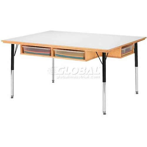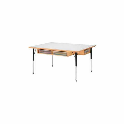 Workspace and storage for six. White laminate tabletop with Birch edgebanding. E-Z to install table legs adjust in one-inch increments. Two adjustable leg heights to choose from. 36″ wide x 48″ long x 15″ to 24″ high.
