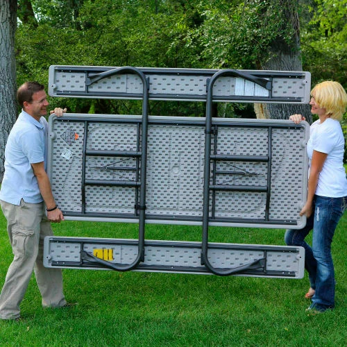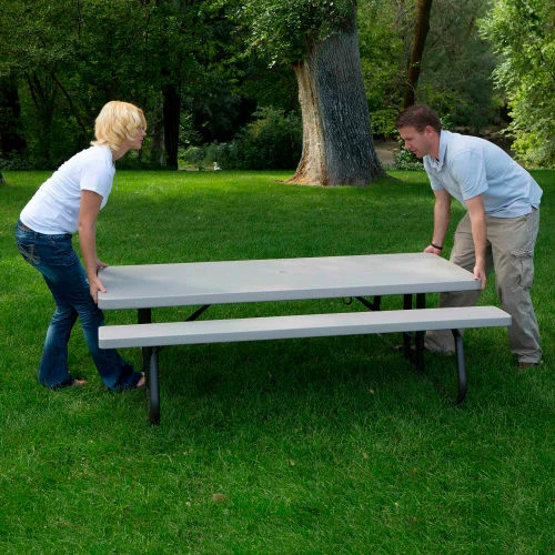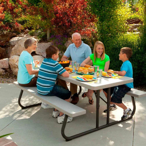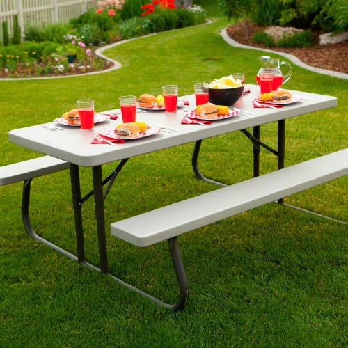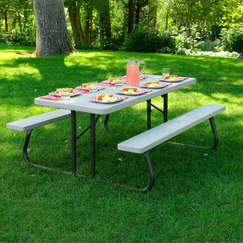 Lifetime 6-Foot Picnic Table – The 72 in. x 30 in. high-density polyethylene table top is stain resistant, easy to clean and folds flat for storage. This model comes in putty with a bronze, 1-5/8 in. round folding frame and includes an umbrella hole and cap. Single box packaging. 2-year limited warranty.