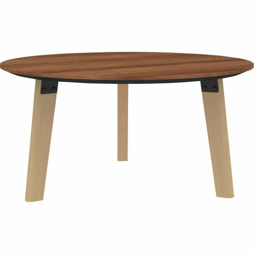 Round coffee table offers a useful addition to your reception or lounge area. The knife edge gives it a crisp look. Walnut laminate tabletop contrasts the three natural wood legs for a modern edge. Coffee table is part of the Lorell Relevance Series, versatile and stylish office furniture that configures to meet your needs.