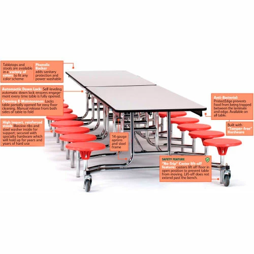 - Safety Feature: “No-Trip” Caster Lift-Off Feature: Casters Lift Off Floor in Open Position to Prevent Table from Moving. Lift-Off Does Not Extend Past the Bench