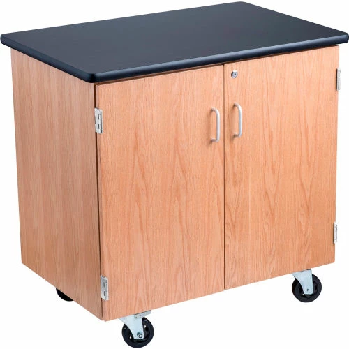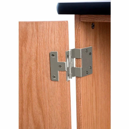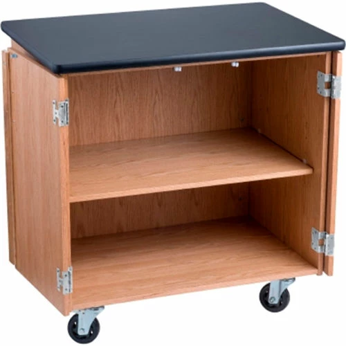 The new National Public Seating mobile science storage cabinet is an important addition to our science lab offering. It functions as a workstation, mobile storage cabinet and as a demonstration table. The cabinet features a fully oak veneered interior and exterior and is constructed with a resilient plywood core. Our heavy duty Cobra wrap-around hinges support the doors for use under extreme circumstances and enable them to be opened 270 degrees. The cabinet is outfitted with a High Pressure Laminated tabletop which is compliant with NEMA standard testing, making this mobile science storage cabinet the #1 choice for every science lab requiring strong and durable equipment. It also comes with four heavy-duty 4″ swivel locking casters for mobility with ease, and a door lock to keep cabinet contents safe. Interior shelf is adjustable in 1″ increments with five different height options to choose from. This unit ships ready to assemble with an easy to follow four step assembly process.