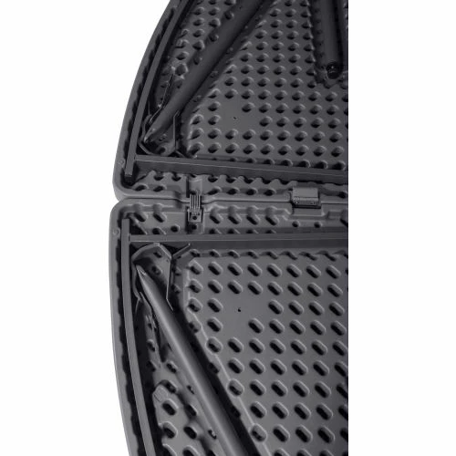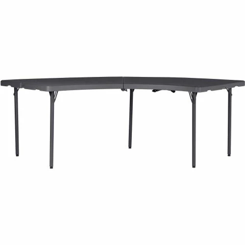 Zown commercial resin folding moon shaped (crescent) fold in half table, solely distributed by Cosco, is a multipurpose table. Made from high density resin and can be used indoors or outdoors. Steel frame for durability. Easy to set up, taken down and transport. Non marring foot caps. 200 lbs. capacity. 10 year limited warranty. All shark grey color. Open dimensions 96″ x 30″ x 29.2″. The tables, when standing alone, can seat up to 3 – 4 people at a time. However, for a maximum capacity seating of 12 – 16 persons, these tables can be paired together with the 71″ round blow mold table for a pleasant, conversational setting. Table is light weight at 41 lbs.